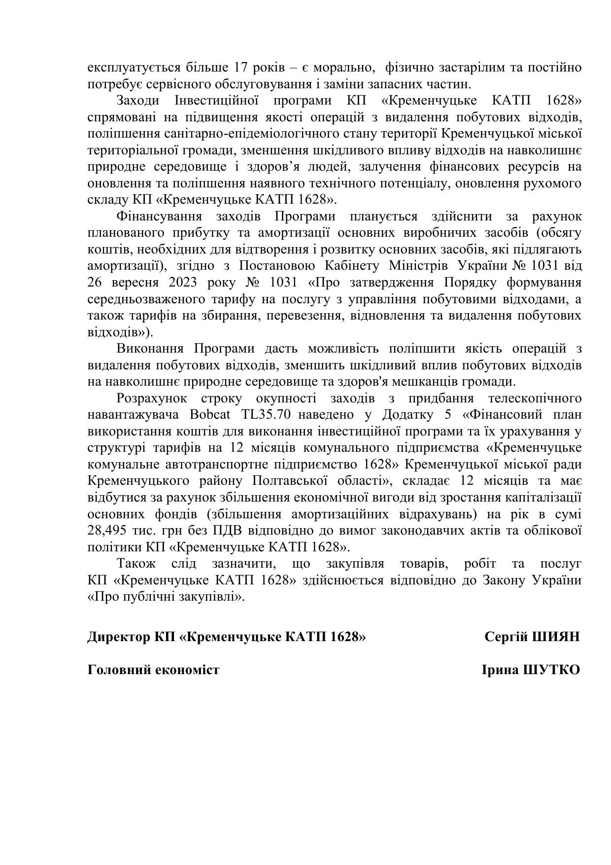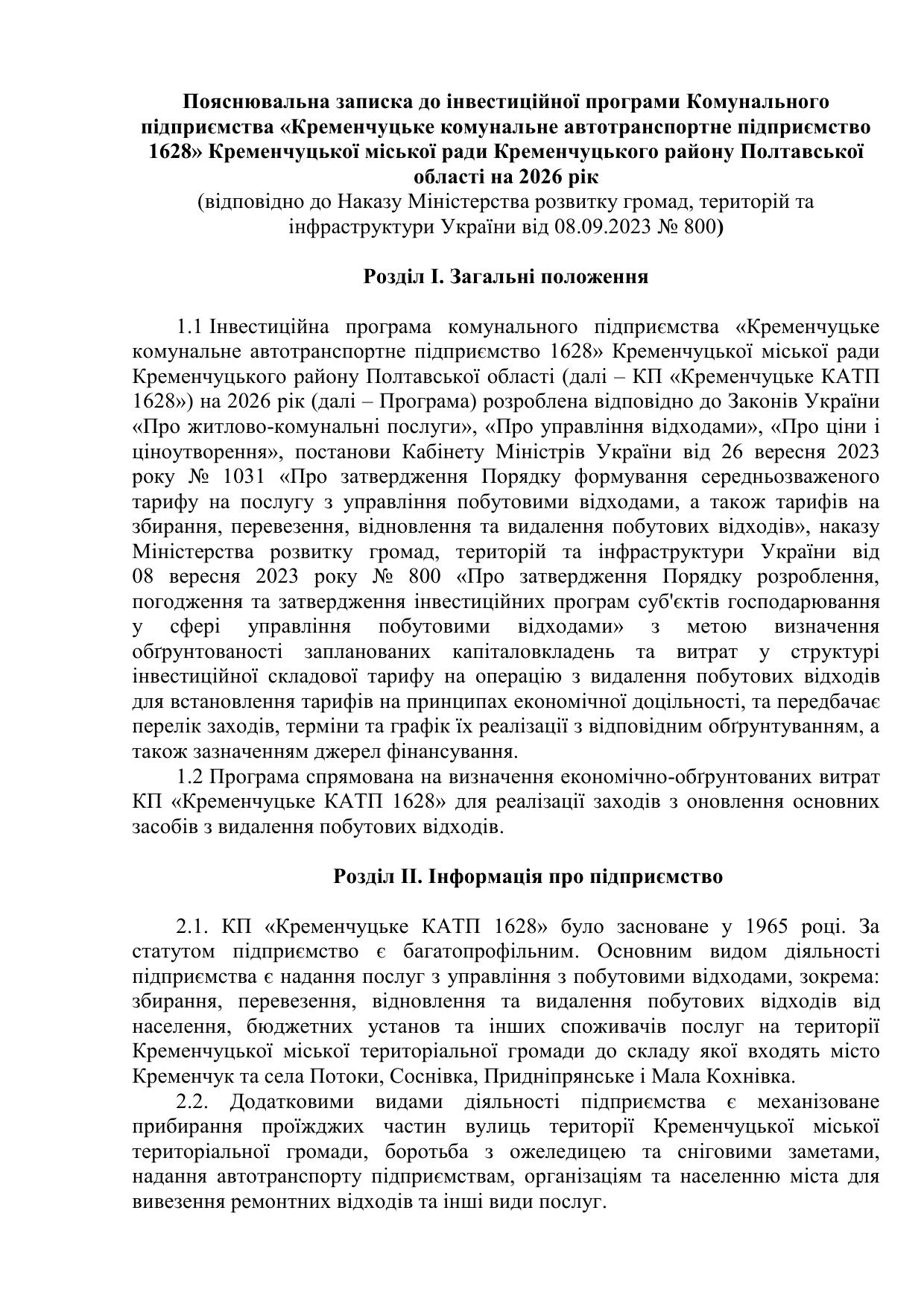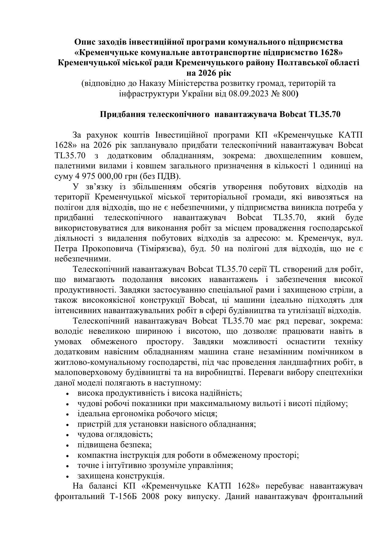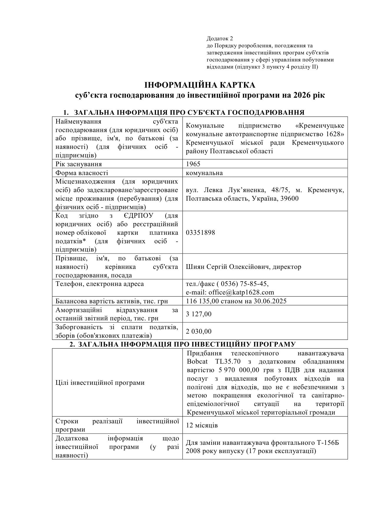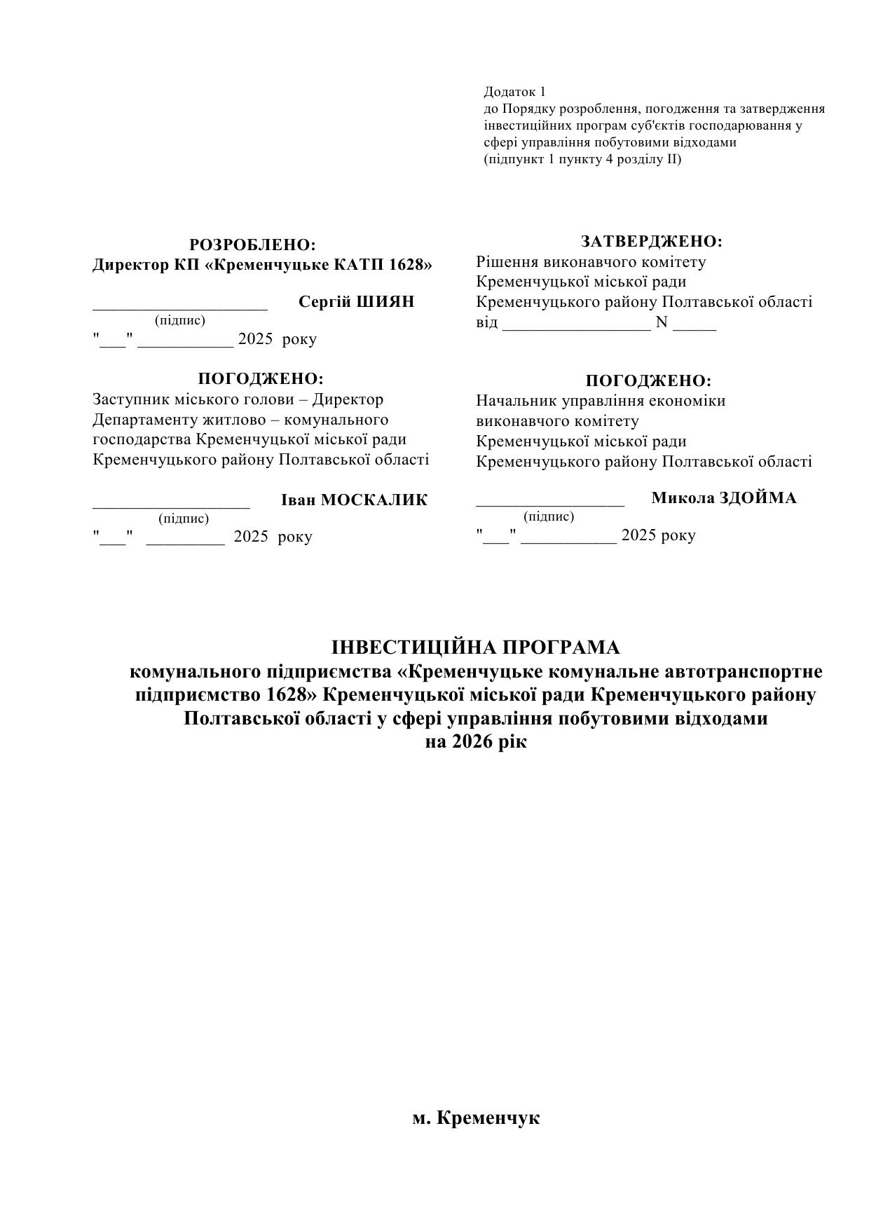 Проєкт інвестиційной програми КП "Кременчуцьке КАТП 1628" на 2026 рік
