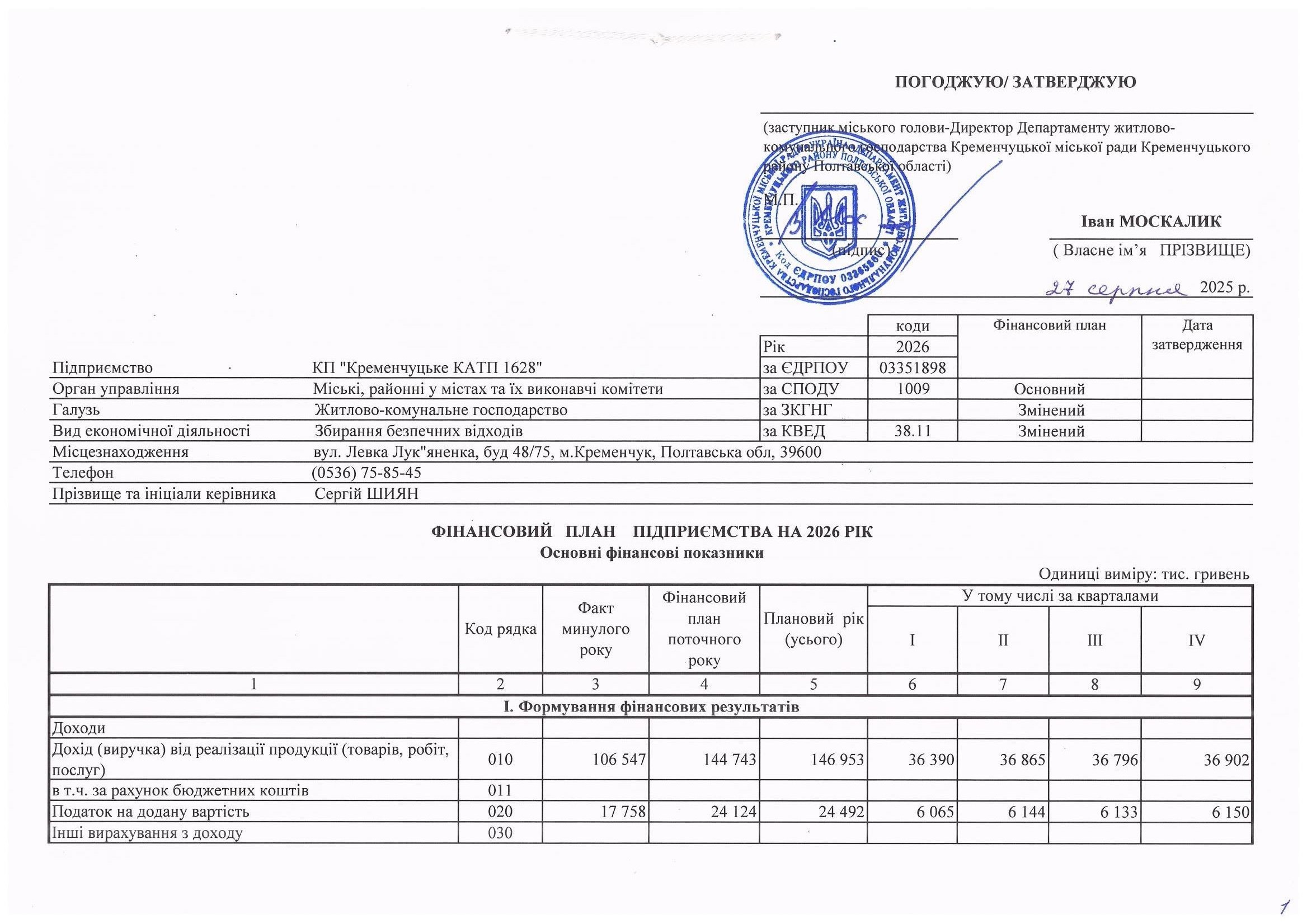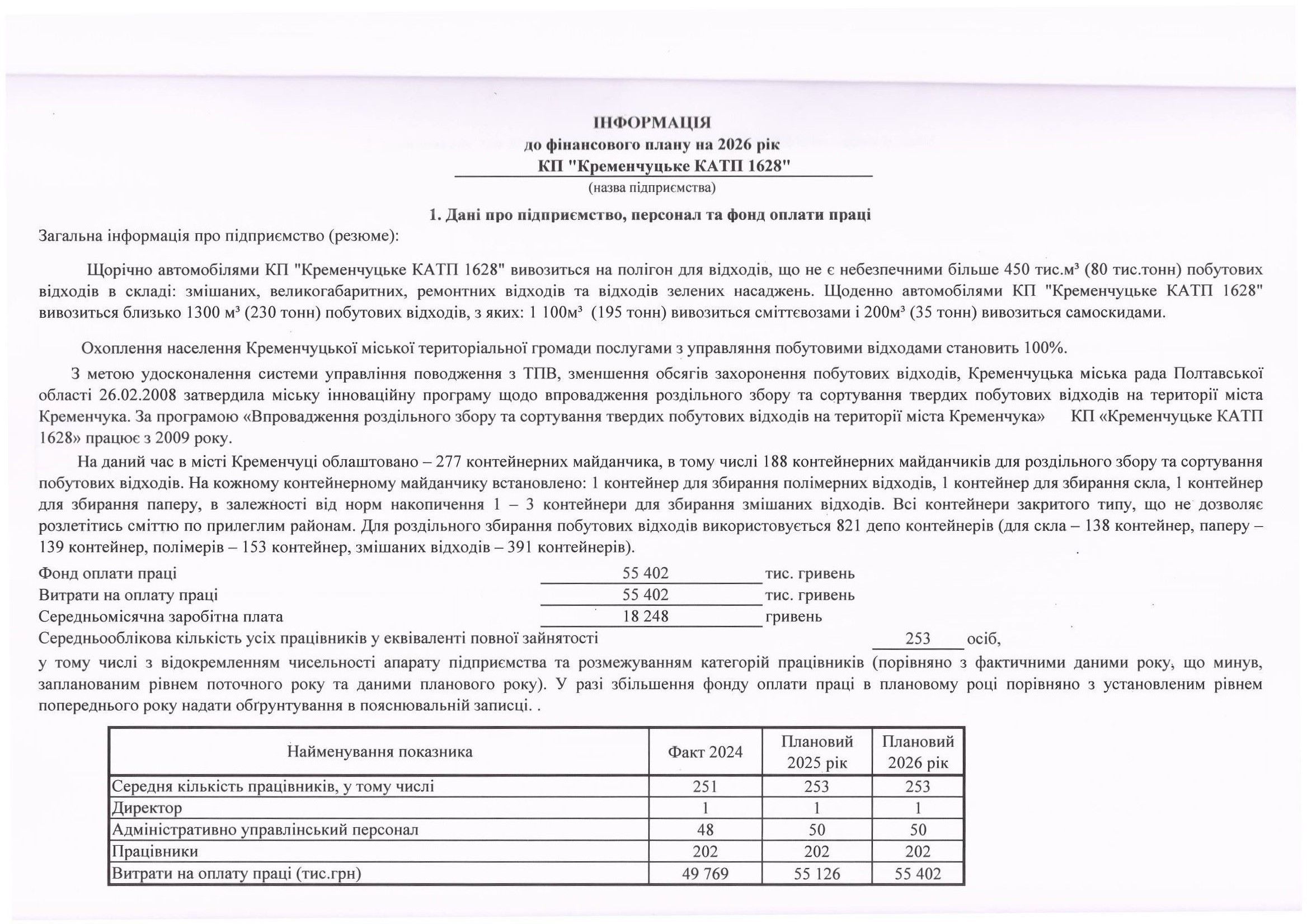 Фінансовий план КП "Кременчуцьке КАТП 1628" на 2026 рік