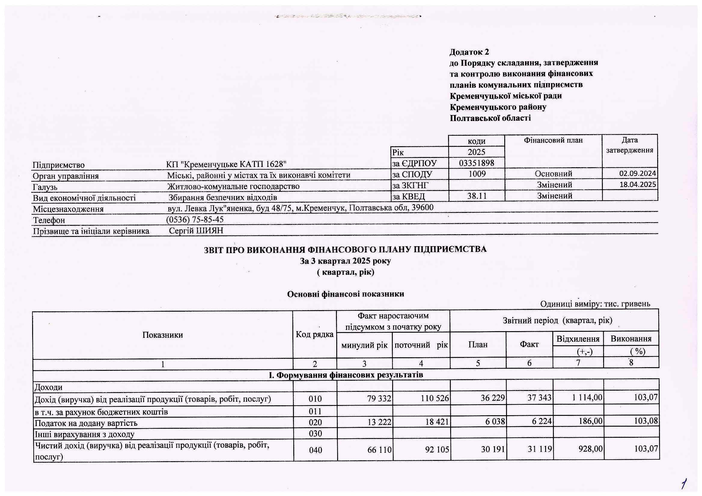 Звіт про виконання фінансового плану за 3 квартал 2025 року