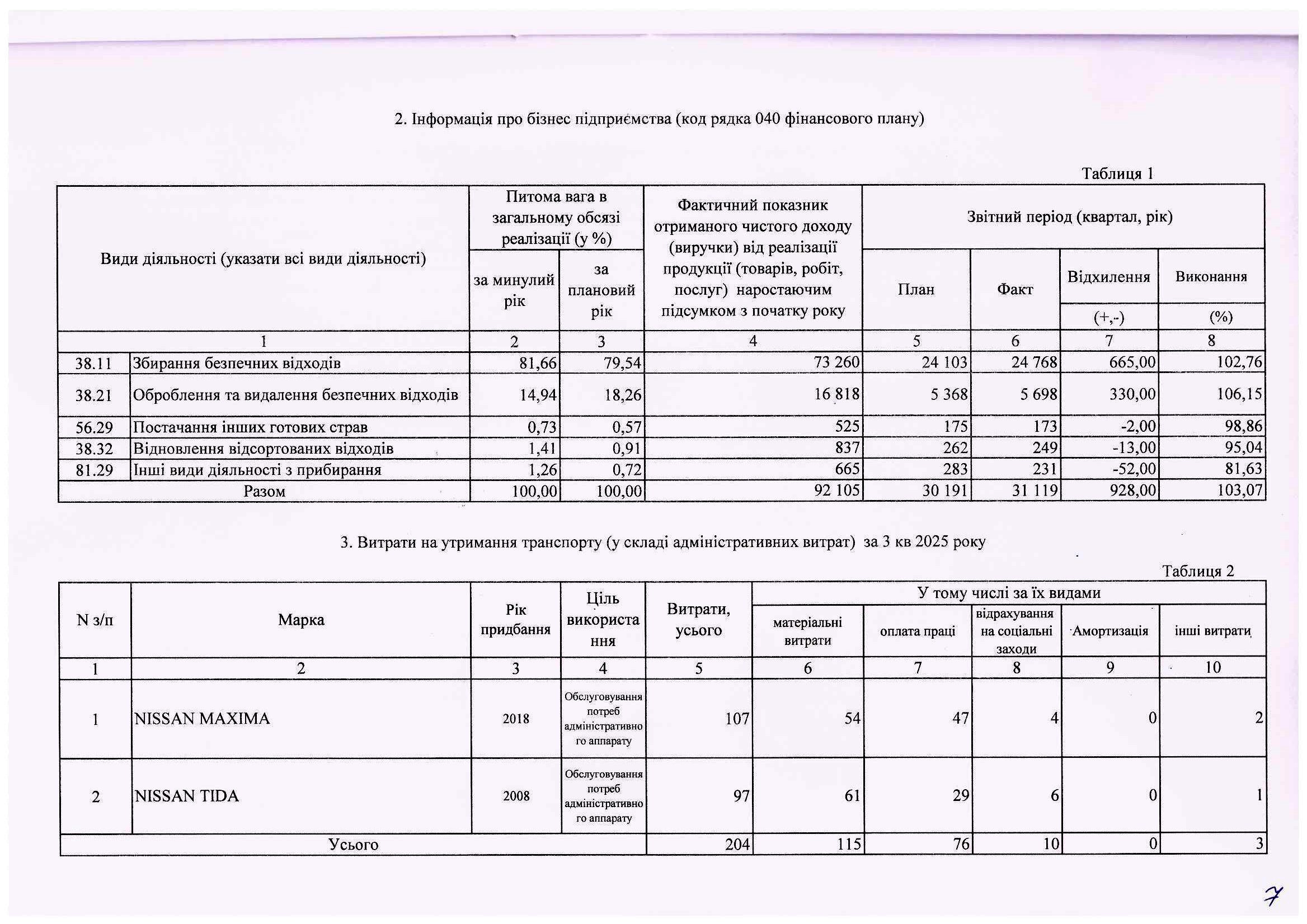 Звіт про виконання фінансового плану підприємства за 1 квартал 2025 року